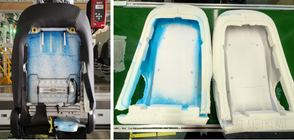 接下來帶著大家看看消音蠟的應(yīng)用位置,下圖聚氨酯泡沫藍(lán)色部分就是噴涂了消音蠟。